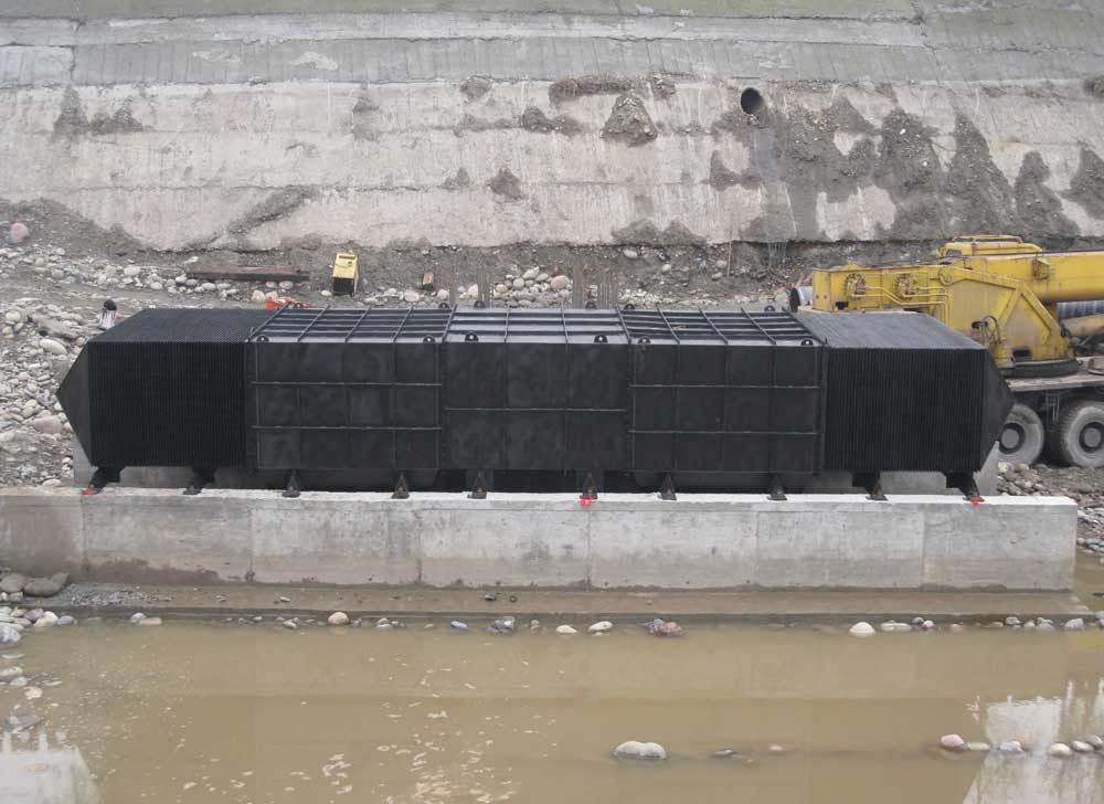 鋸齒形側(cè)向流斜板取水頭部主要由鋸齒形和帶側(cè)向流斜板的排砂斗等組成,前者主要根據(jù)背向開孔和產(chǎn)生運動等來實現(xiàn)高效防草;后者排砂斗能自動形成懸浮砂層,阻止或大大減弱水流干擾,并巧妙地利用河流水流的天然能量,實現(xiàn)高效自動除砂。效果