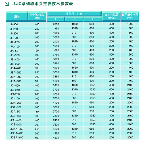 J型取水頭部適用于需要防草的取水工程。如:草多砂少或草砂較細即砂粒粒徑在0.1亳米以下的江河取水工程。JC型取水頭部適用于即需要防草,又需要除砂的江河,特別適用于山區(qū)河流的取水工程。